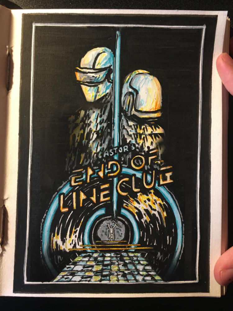 The main idea that I was exploring when coming up with different designs was having the visual of the Light Discs from the films double as a vinyl record disc. I felt that they gave a lot to work with visually, since I’d be able to have lots of lines and abstract streaks of colour that could function as both ridges on the vinyl disc, and also as neon light coming from the Tron light disc. I also (clearly) wanted to feature Daft Punk in the illustration, since the soundtrack they create for the film (and the music they play in-universe at Castor’s End of Line Club) is absolutely intrinsic to the atmosphere of the film. At the bottom of the design is a grid, something familiar in TRON but also something that doubles as a dancefloor, where Castor can be seen atop his floating staircase, striking the iconic TRON pose with his cane.