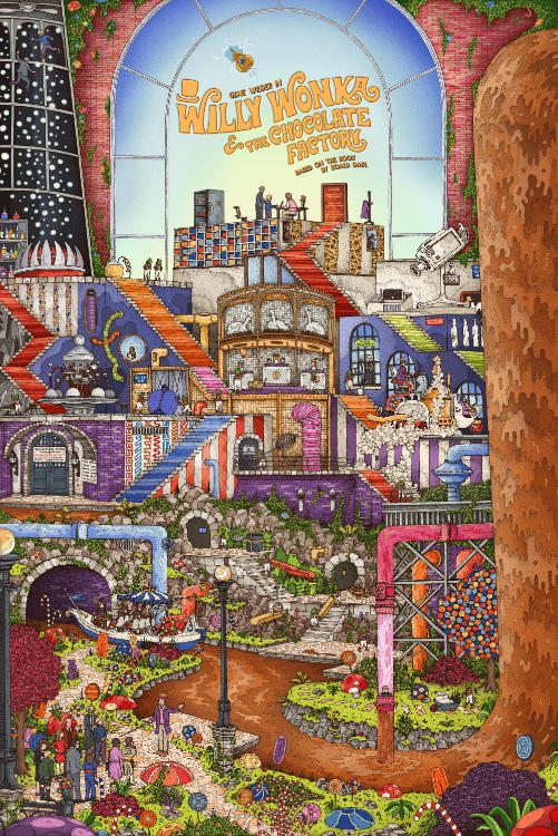 Even by my own standards, this one is pretty crazy! This is an illustration I worked on towards the back end of 2024 (and a touch into 2025) for the 1971 film ‘Willy Wonka & The Chocolate Factory’ starring Gene Wilder. There was a lot of work that went into this one, both in early development and during the final colouring stages. It was a tough nut to crack, but I’m delighted with how it came out.