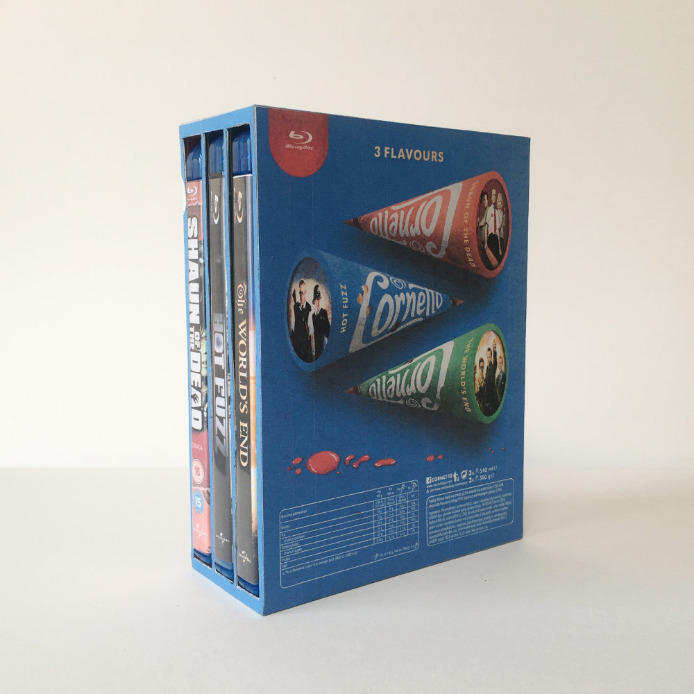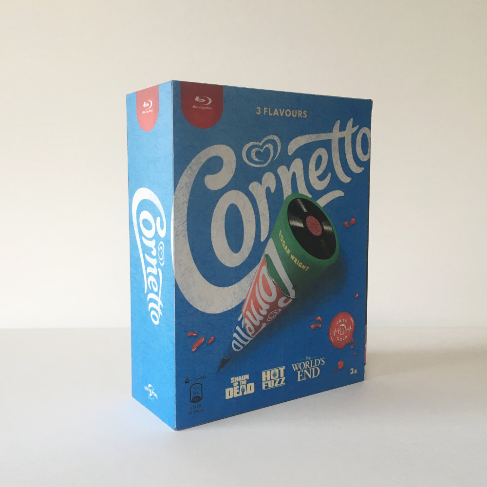 This was a really fun project I came up with and created over the course of a weekend. I’d long wanted to make something for the Cornetto Trilogy but couldn’t come up with a connective tissue for the films that hadn’t already been tackled. Then one night it hit me whilst I was falling asleep: put the Blu-Rays inside a box of Cornetto’s! I wasn’t even thinking about the trilogy so I’m not sure where the idea came from, but in hindsight it seems like a really obvious idea. I’m sure someone else must have had the same idea at some point, but I didn’t do any research so I could keep my own idea fresh in my brain.