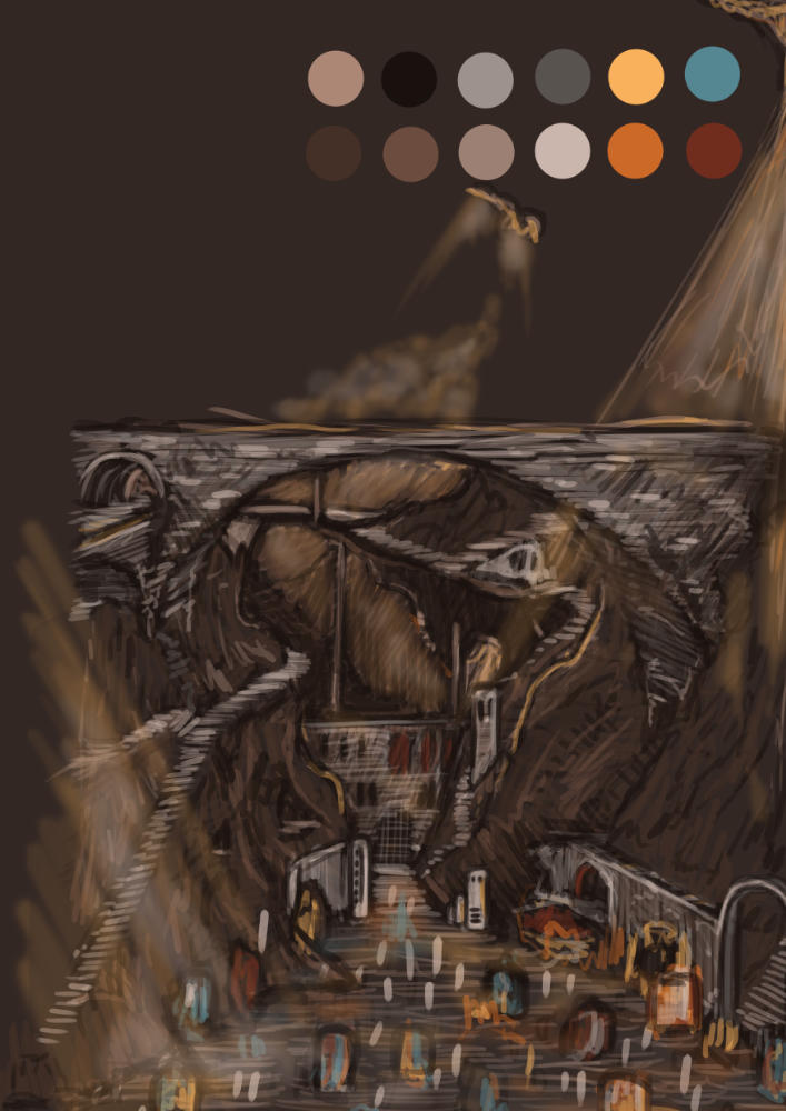 The drawing started as a quick sketch on a piece of paper. The starting point of the idea was basically “a long, narrow, lived-in cavern that has bridges connecting either side”. It was quite a simple sketch initially, but the core ideas of the bridges and the marketplace on the bottom were there from the beginning.