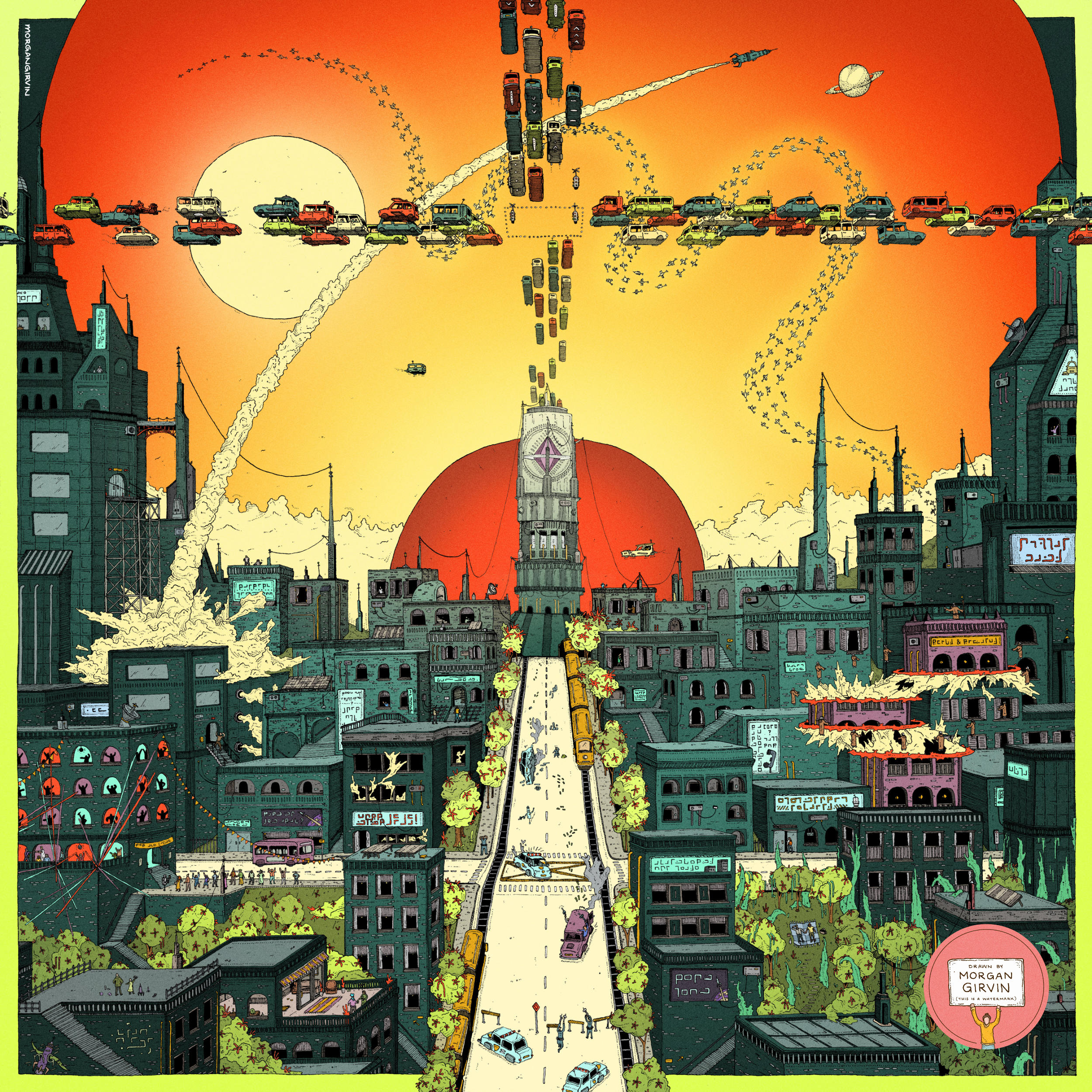 I had a lot of fun listening to the music and having a back and forth conversation with Ocular Bats over what we felt best suited each track, trying to find details/events/scenarios that felt different from one another but also felt like they were a part of the same world. Overall there are 8 tracks on the album, and they’re all captured in a moment somewhere within the drawing. Some moments are big, other moments are small. There are also other details built within the drawing (I mean it wouldn’t feel like an occupied world if there weren’t other things going on) which I think is quite nice as it allows people looking over the art/listening to the album to find their own interpretation of the tracks, and find their own visual representation of the music.